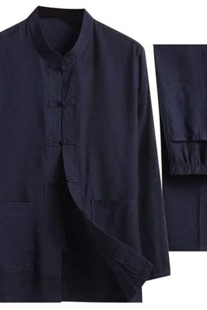 Men Cotton Linen Tai Chi Set Chinese Traditional Tang Suit Martial Arts Clothing Shirts Trousers Tai Chi Kung Fu Uniform Two Pieces Dark blue-Medium