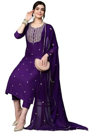 GoSriKi Women's Cotton Blend Embroidered Straight Kurta with Pant & Dupatta