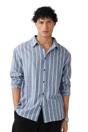The Souled Store Cotton Linen Stripes: Nautical Men and Boys Long Sleeves Collared Neck Button Front Grey Striped Regular Fit Lightweight Summer Cotton Linen Shirts