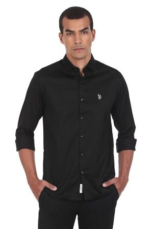U.S. POLO ASSN. Men's Cotton Stretch Fit Solid Satin Stretch Spread Collar Barrel Cuff Casual Shirt