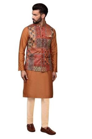 KISAH Mens Kurta Jacket Trouser Set, Long Sleeves Printed Mandarin Silk Blend Collar, Multi Ethnic Wear Set for Men