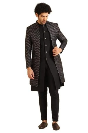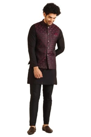 KISAH Men's Indo-Western Waistcoat Sherwani Trouser Set, Black Jacquard, Woven Design Regular Fit Mandarin Collar Long Sleeves