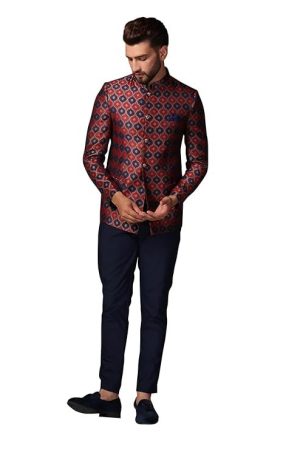 KISAH Mens Jodhpuri Bandhgala Trouser Set Silk Blend Jacquard, Ethnic Wear for Men, Maroon