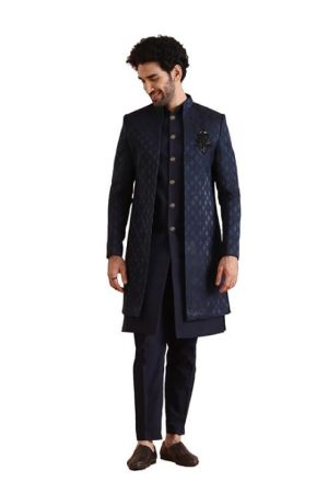 KISAH Mens Jacket Sherwani Trouser Set|Silk Blend Fabric Jacquard Pattern Indo-Western Sherwani Set for Men|Regular Fit Mandarin Collar Long Sleeves