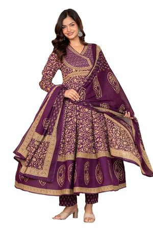 Pistaa's Women's Pure Cotton Anarkali Floral Printed Hand Work Kurta with Pant & Dupatta Set