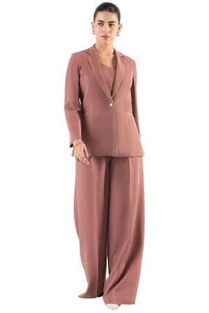 Powersutra Women’s Dusty Peach 3-Piece Formal Suit | Tailored-Fit Blazer, Waistcoat & Mid-Rise Trousers | Stretchable Fabric, Notched Lapel, Button Closure | Office & Business Wear