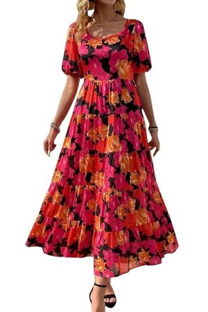 PRETTYGARDEN Womens Dresses 2024 Puff Sleeve Floral Casual Summer Dresses Smocked Backless Beach Flowy Tiered Maxi Dress