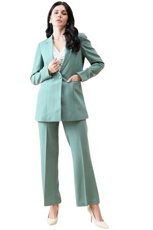 Powersutra Women's Sage Green Notch Collar Stretch Suit with Blazer & Trousers | Single-Breasted | Button Closure | Elastic Waist Pants