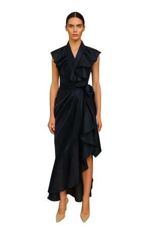 Prisella Navy Blue Glazed Organza Ruffle Gown for Women | Luxury Designer Western Dress | Asymmetrical Indo for Wedding, Cocktail, Birthday & Evening