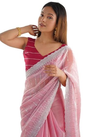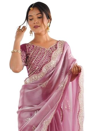 SIRIL Women's Organza Sequence Embroidery Scollped Border Saree With Unstitched Blouse Piece
