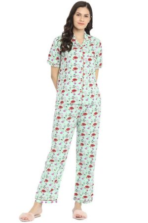 Shopbloom Pure Cotton Notched Collar Lips Don't Lie Print Short Sleeve Women's Night Suit Set with Pajama | Night Dress | Nightwear for Ladies