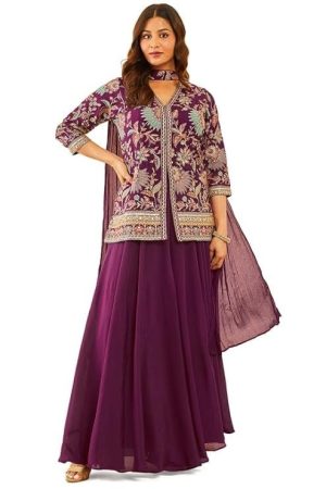 Soch Womens Wine Georgette Beadwork Embellished A-Line Chudidar Suit Set with Shrug