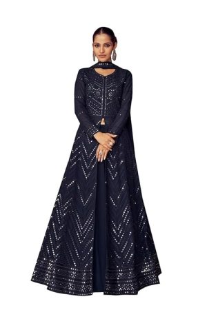 TRENDMALLS Women's Georgette Embroidery Anarklai Suit Set Kurta Lehenga with Dupatta Blue Kurta Set for Women