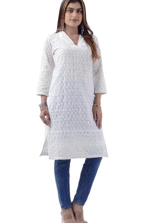 Tromboo Hand Chikan Allover Embroidery White V Neck Glaze Cotton Kurti for Women