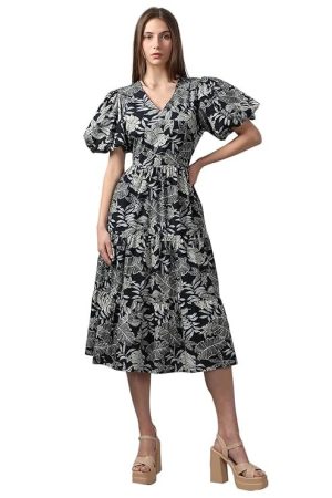 VERO MODA Women Floral Printed V-Neck Puff Sleeve Fit & Flare Midi Dress