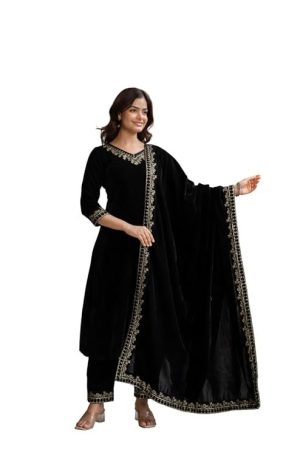 TRENDMALLS Women's Velvet Embroidery Salwar Suit Set Kurta Pant with Dupatta for Women
