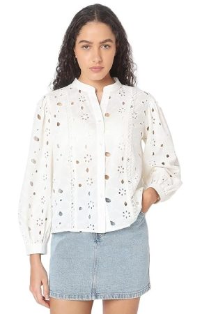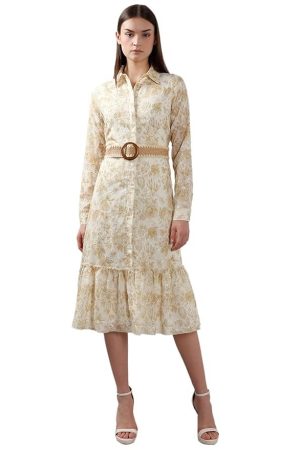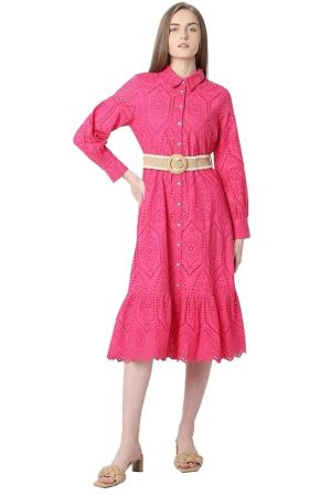 VERO MODA Women Schiffli Shirt Collar Cuffed Sleeves Pure Cotton A-Line Midi Dress