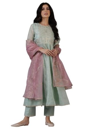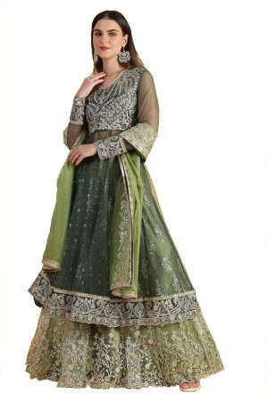 Wishful Women's Green Metallic Embroidery Mesh Flared Kurta & Skirt with Dupatta Set