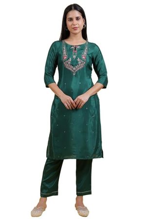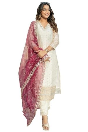 VredeVogel Women's Chanderi Silk Embroidered Kurta with Pant & Organza Dupatta Set | Casual Outfit Ethnic Kurta Set for Women | Modern & Traditional Blend Ethnic Wear