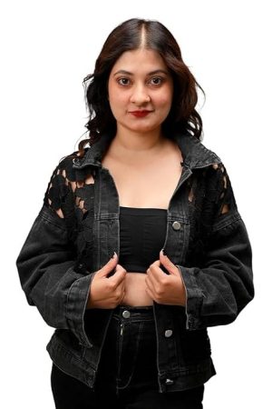Bithsha Black Floral Cut-Out Back Denim Jacket for Women | Unique Designer Embroidered Lace & Ventilated Mesh Back | Regular Fit Casual Outerwear | Stylish Gift for Girls, Birthday & Anniversary