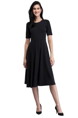 FableStreet Cotton Round Neck Knitted Fit and Flare Dress - Black