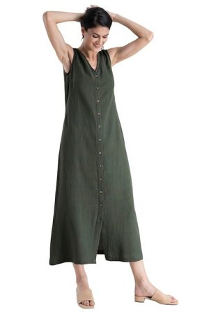 FableStreet Cotton Button Down A-Line Dress - Olive