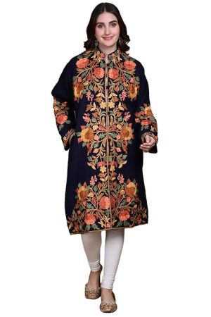 Exotic India Women's Kashmir Wool Long Jacket with Multicolor Floral Aari Embroidered | Beautiful Flower Embroidery Long Woolen Jacket, Coat For Winter