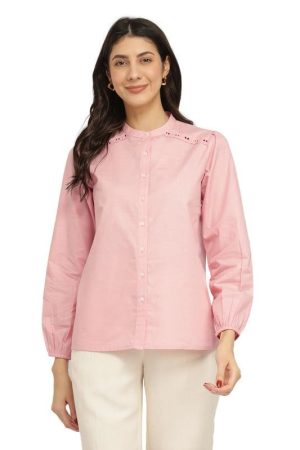 FableStreet Cotton Blend Mandarin Collar Top - Pink