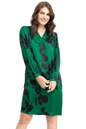 FableStreet Women's V-Neck Green Satin Floral Dress