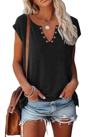 Eachyes Women's Deep V Neck Casual Short Sleeve Loose Fit Fashion T Shirt