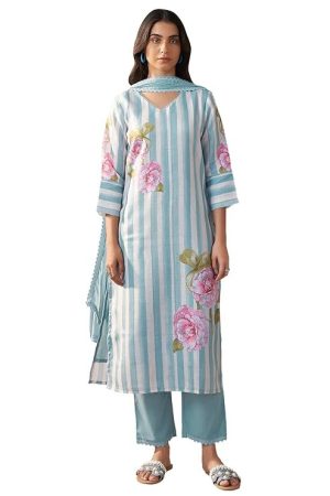 INDO ERA Women's Straight Linen Floral Embroidered Kurta Pant with Dupatta Set