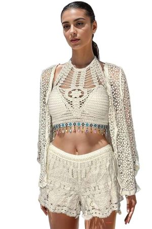 ICW Women's Leisure Boho Crochet Crop Halter Neck Top Backless Lace-up Low Rise Shorts Light Jacket Shorts Cardigan Suit Beachwear Bikini Set Three-Peice Swimsuit Co-ord Set