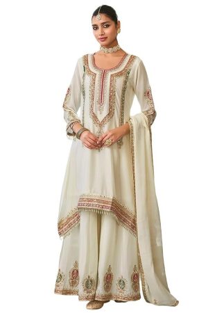 INDO ERA Women's A-Line Chinon Ethnic Motifs Embroidered Kurta & Palazzo with Dupatta Set