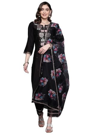 INDO ERA Women's Black Silk Blend Embroidered Straight Kurta & Pant with Dupatta Set (