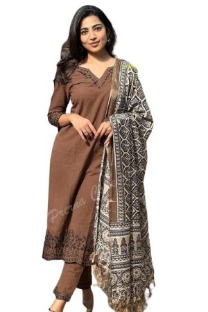 ADINATH-TRADERS Women Pure Cotton Brown Kurti Pant Dupatta Set
