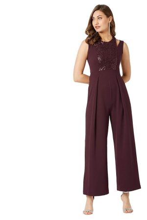 Miss Chase Women's Halter Neck Sleeveless Solid Wide Leg Sequin Paneled Regular Length Jumpsuit