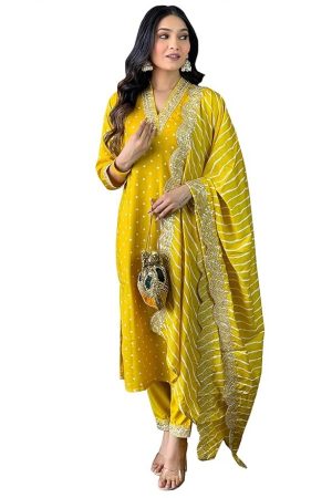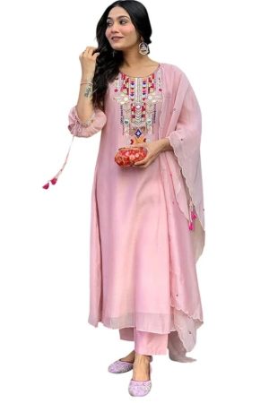 Naixa Women's Vichitra Silk Embroidered Straight Kurta with Pant and Dupatta Sets