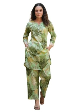 NAINVISH Women's Cotton Blend Green Printed V-Neck Co-ord Set | Daily & Casual Wear